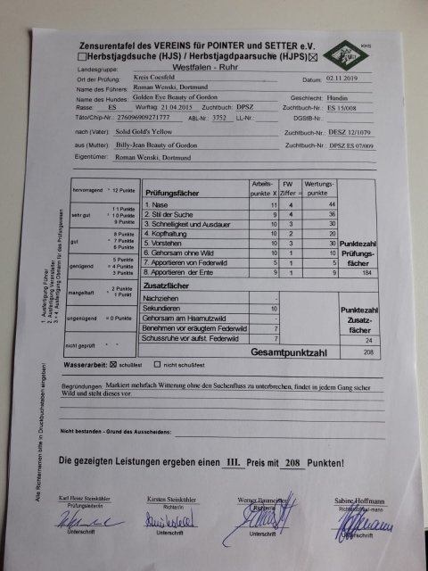 Golden Eye besteht Herbstjagdpaarsuche mit 208 Punkten im 3. PreisHerzlichen Glückwunsch