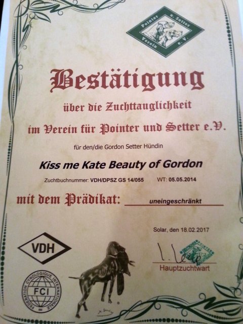 Am 18. Februar 2017 hat Kiss me Kate Beauty of Gordon (Kati) die letzte Hürde für die Zuchttauglichkeit erreicht.