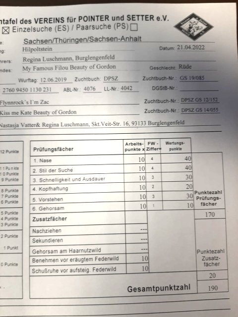 Filou besteht heute in Hilpoltstein die Einzelsuche bei PuS mit genialen 190 Punkten im 1. Preis