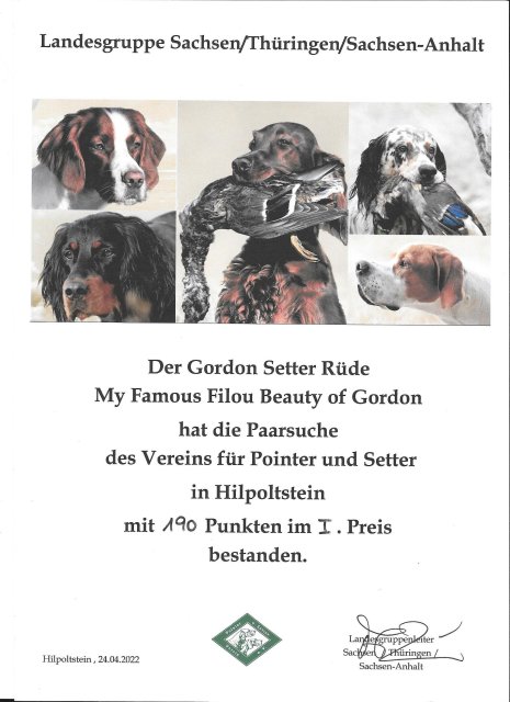 Am 24.04.2022 besteht Filou in Hilpoltstein die Paarsuche mit 190 Punkten im I. Preis