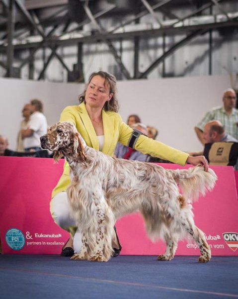Er gewinnt die Offene Klasse, V1 Anw.Dt.Ch(VDH), und BOB! Wird somit bester English-Setter der Show!!